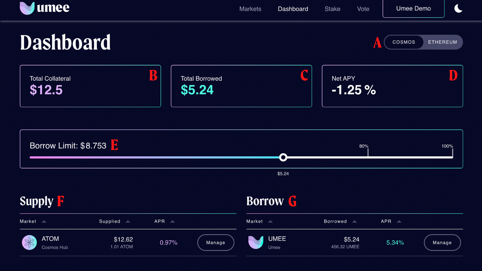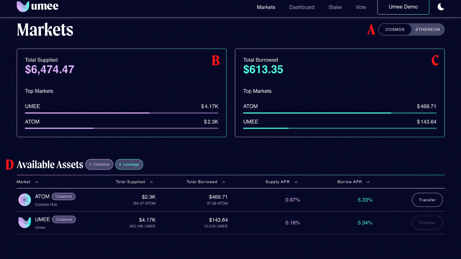 All transfer, lend, and borrow actions can be performed from the Markets section.
